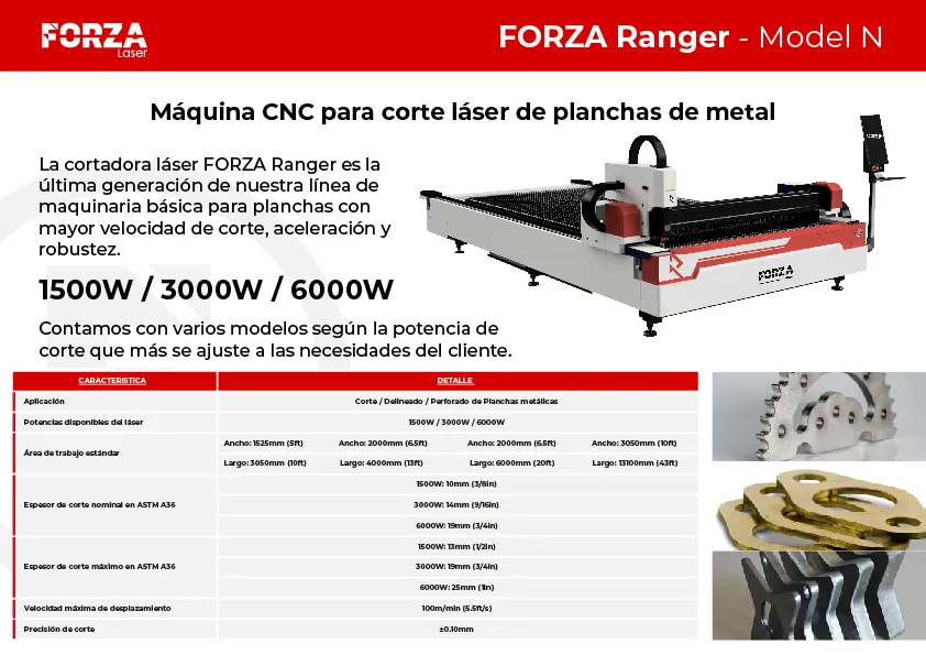 La potencia para cortar metal puede variar según el tipo de aplicación y la cortadora láser de metal que se esté implementando, sin embargo, la máquina de corte láser FORZA ONE utiliza una potencia de 1500 W y un voltaje de trabajo de 220 V monofásico.