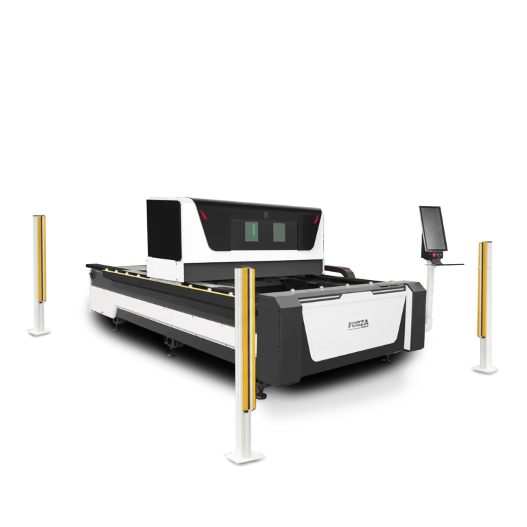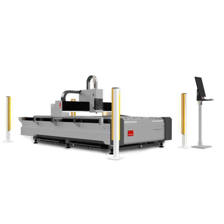 CNC cutting machine with protective cover in the cutting area & laser protection curtains.Power: 1500W / 3000W