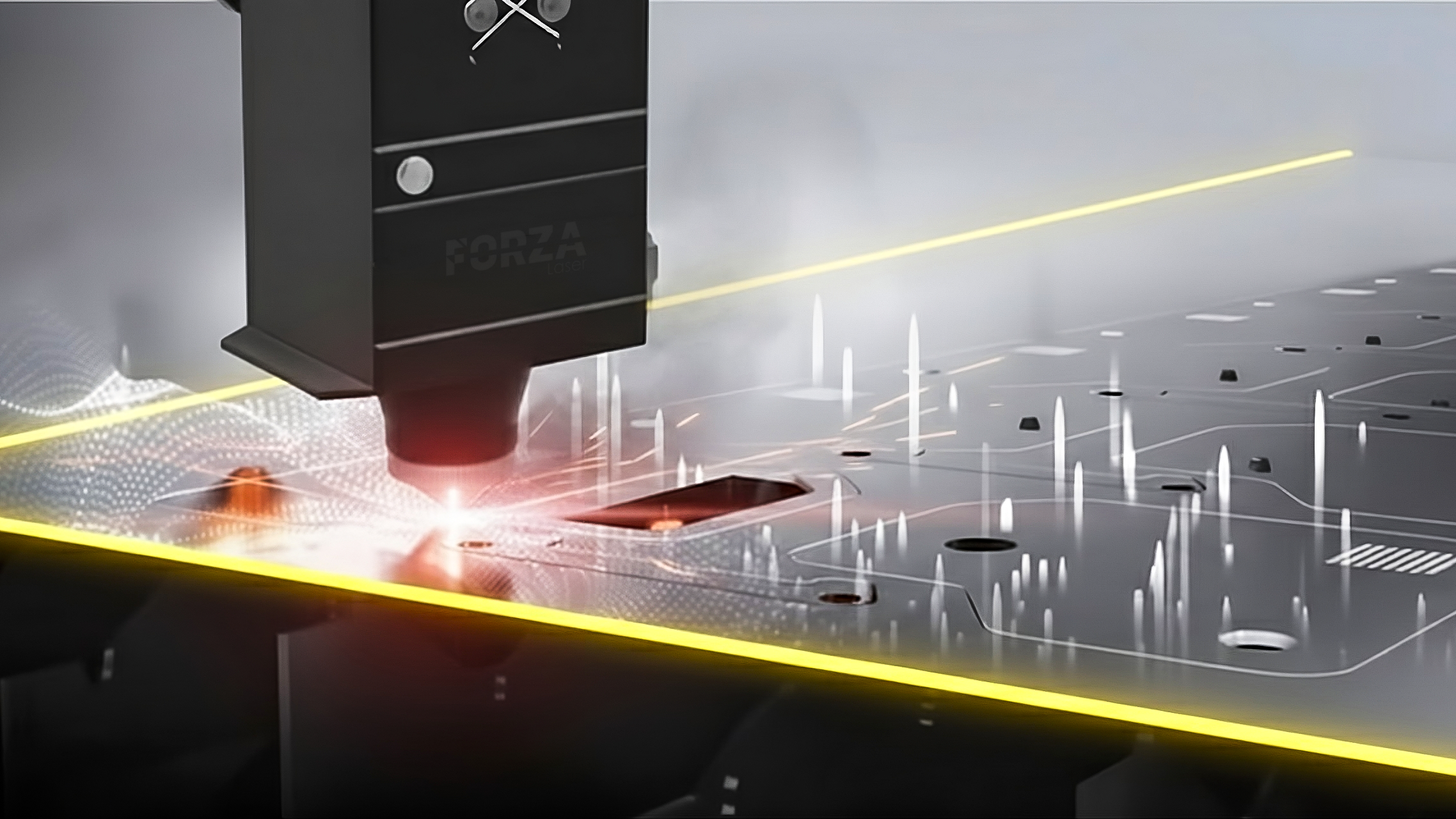Automatic laser head adjustment for working on uneven surfaces. The head maintains a constant distance, even if the plate is warped.