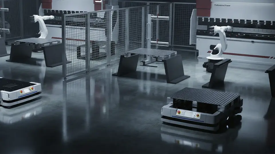 Incorpora AGV’s para automatizar la carga, descarga y el flujo de piezas, elevando la celda de doblado a un entorno Smart Factory totalmente sincronizado.
